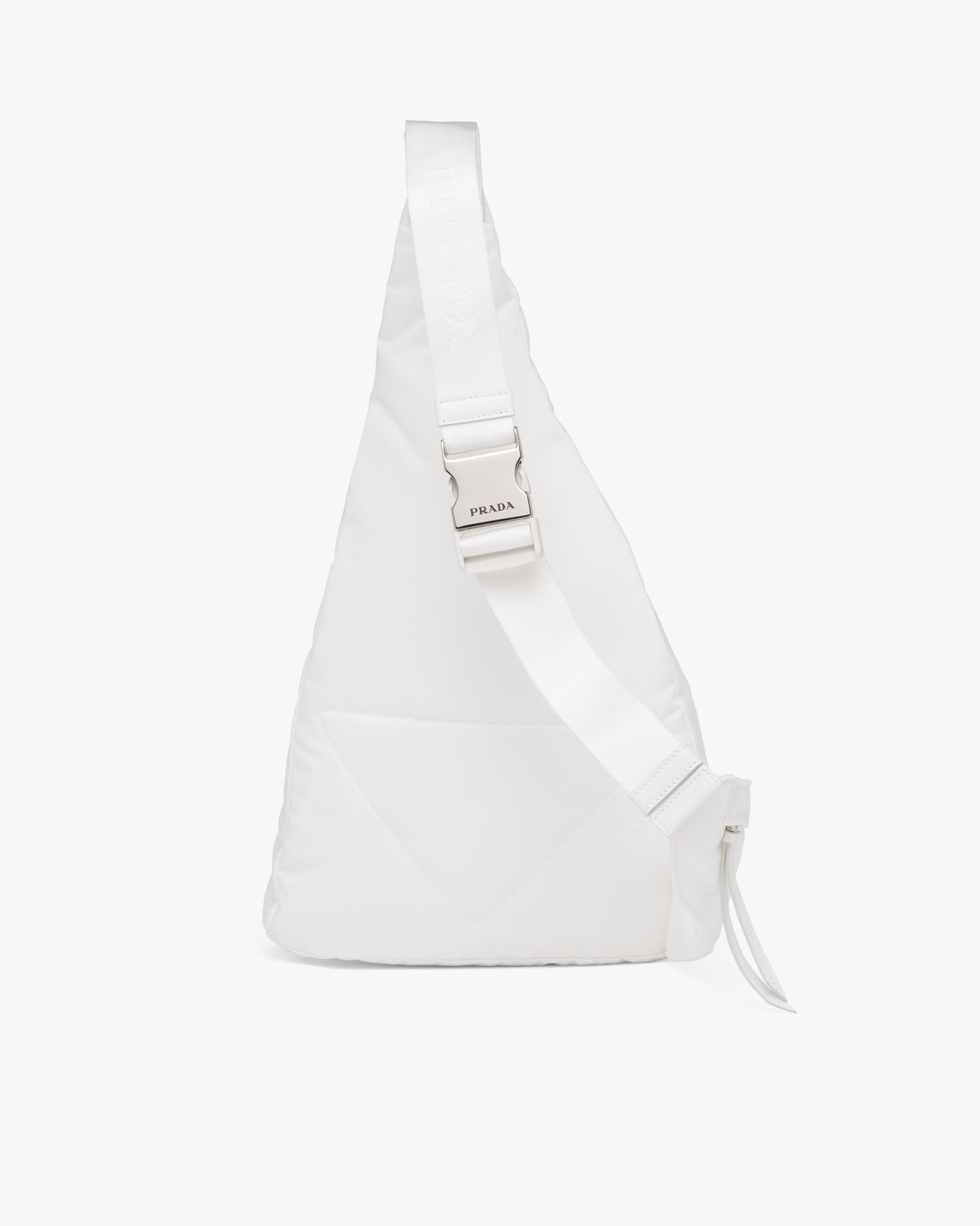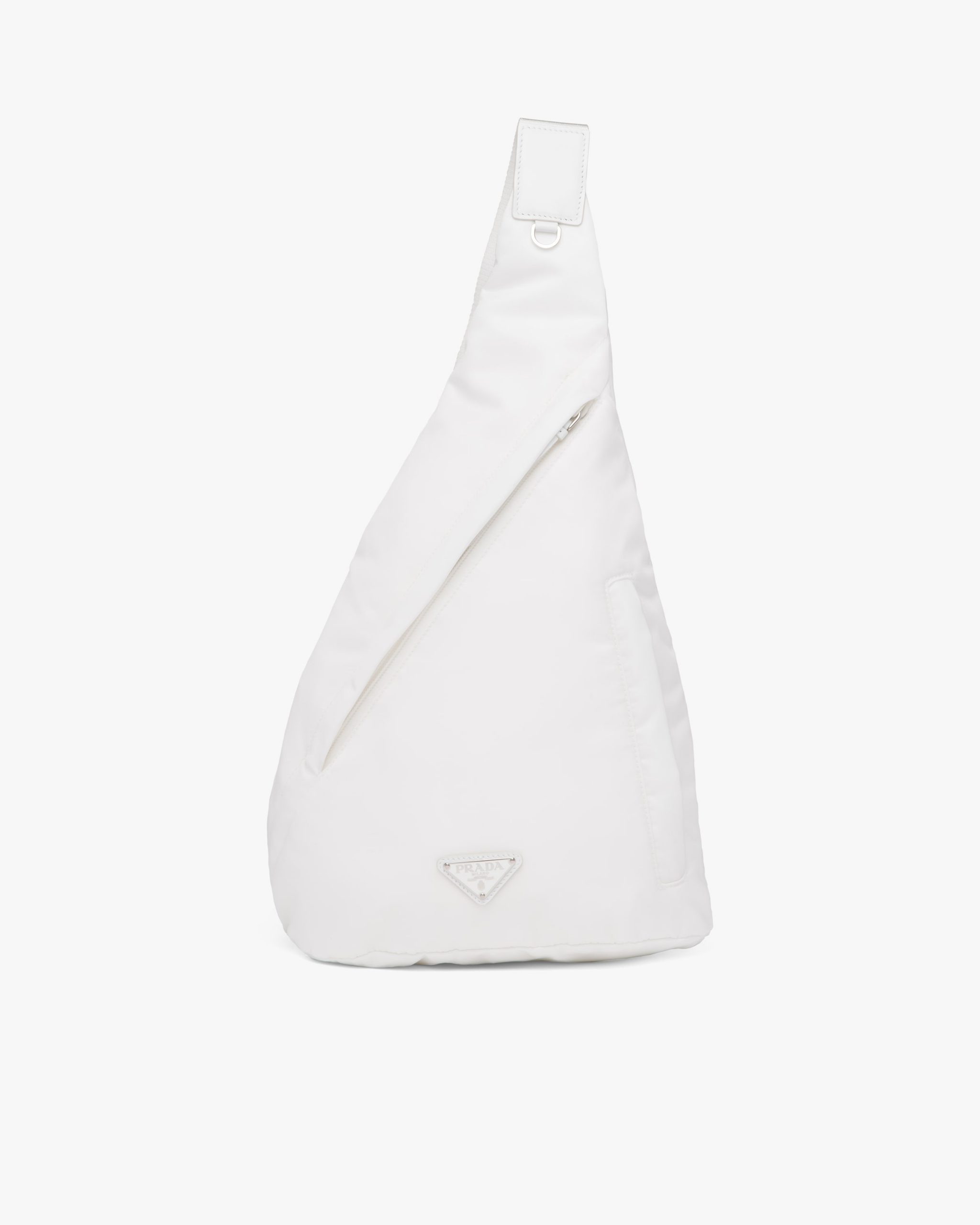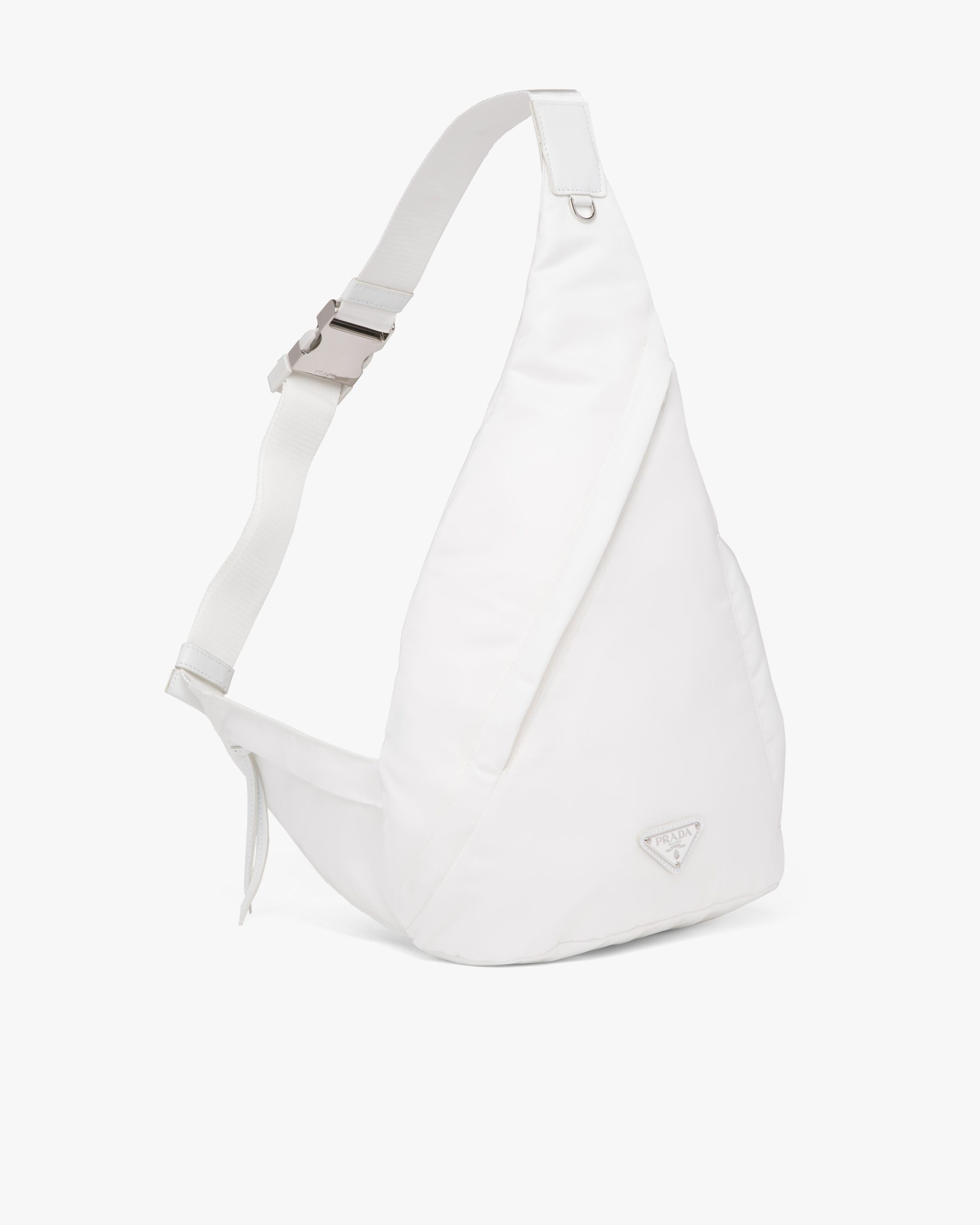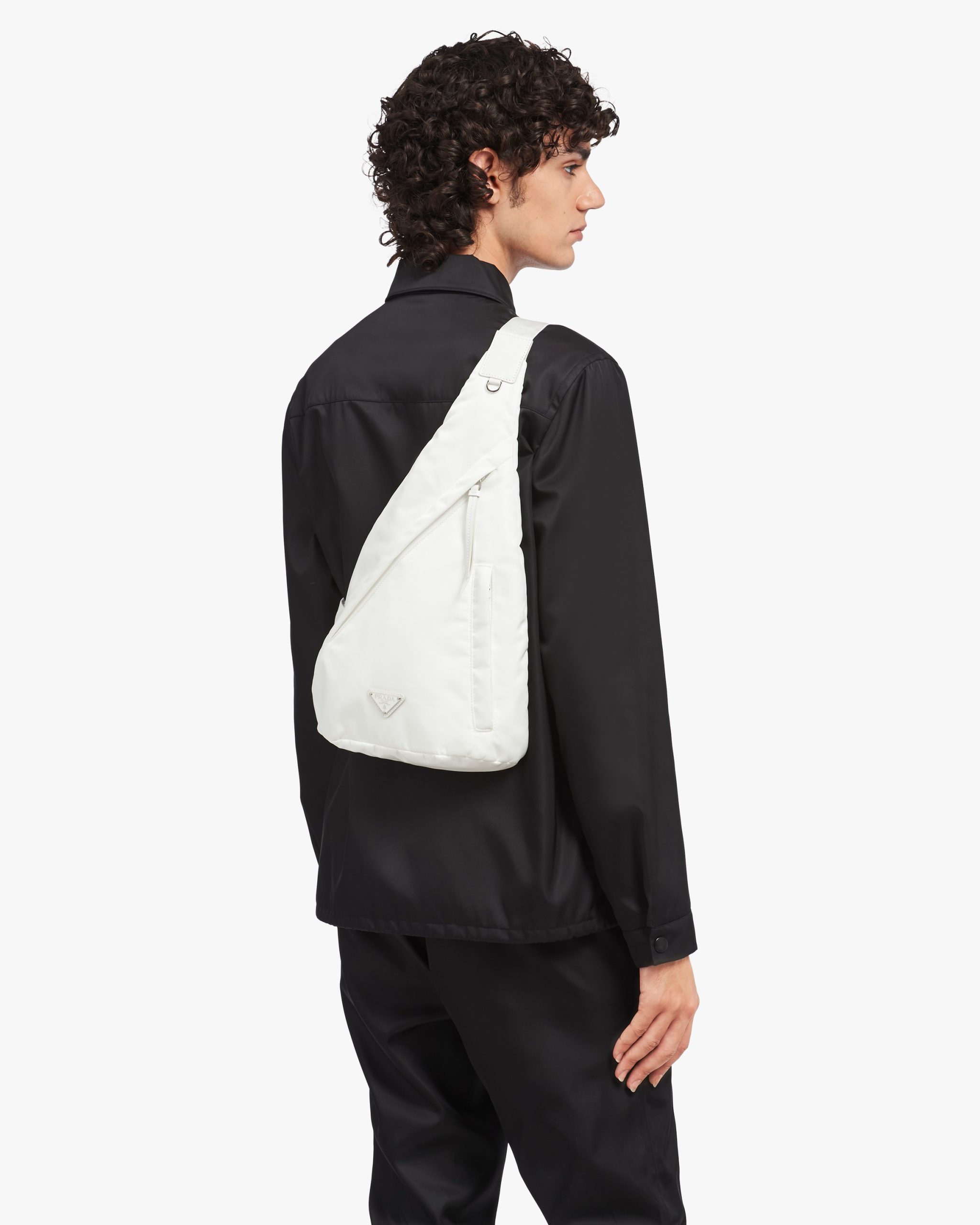 Sleek, minimalist lines are the choice for the new men’s bags for Fall Winter 2021. Defined by its hybrid design, halfway between a backpack and shoulder bag, this accessory has one adjustable woven nylon shoulder strap with side-release buckle and is decorated with the iconic enameled metal triangle logo. The silhouette is made of innovative Re-Nylon, a regenerated yarn produced from recycled plastic trash collectsed in the ocean.