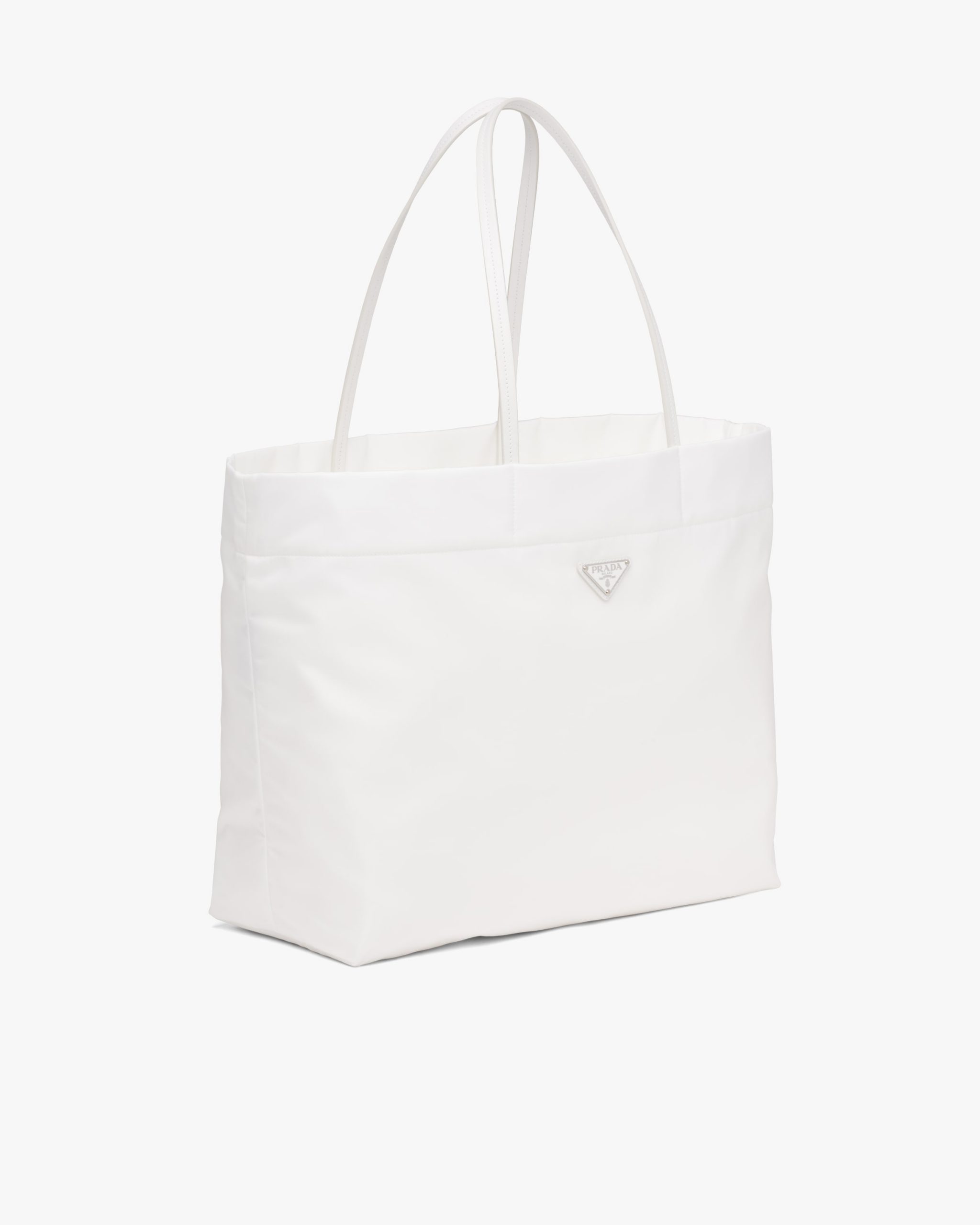 This tote bag characterized by the sleek lines of its design is made of Re-Nylon, the innovative regenerated nylon fabric by Prada produced from recycled, purified plastic trash collectsed in the ocean, fishing nets, and textile waste fibers. Completed with handles made of fine Saffiano leather, the bag is accented by the enameled metal triangle logo.