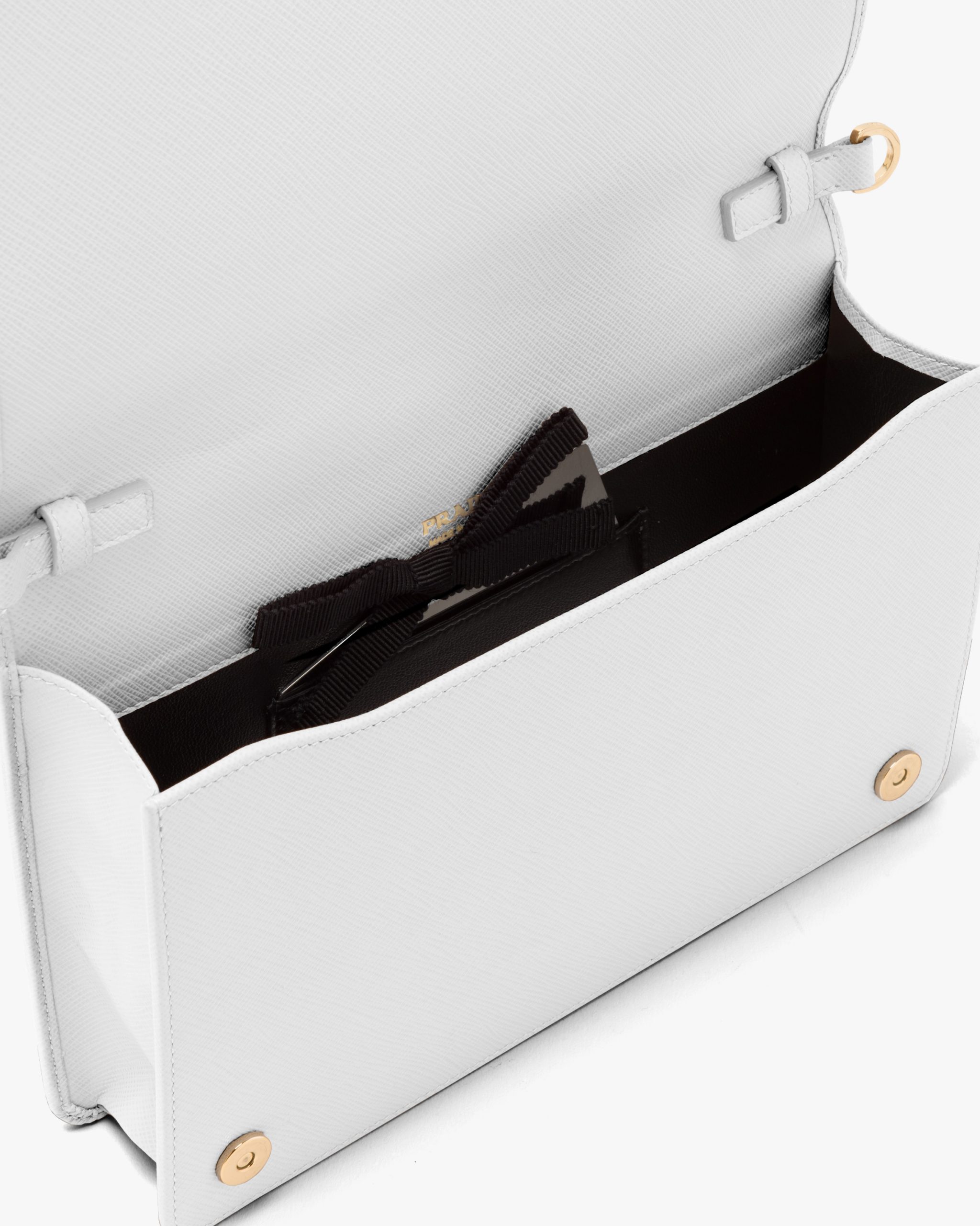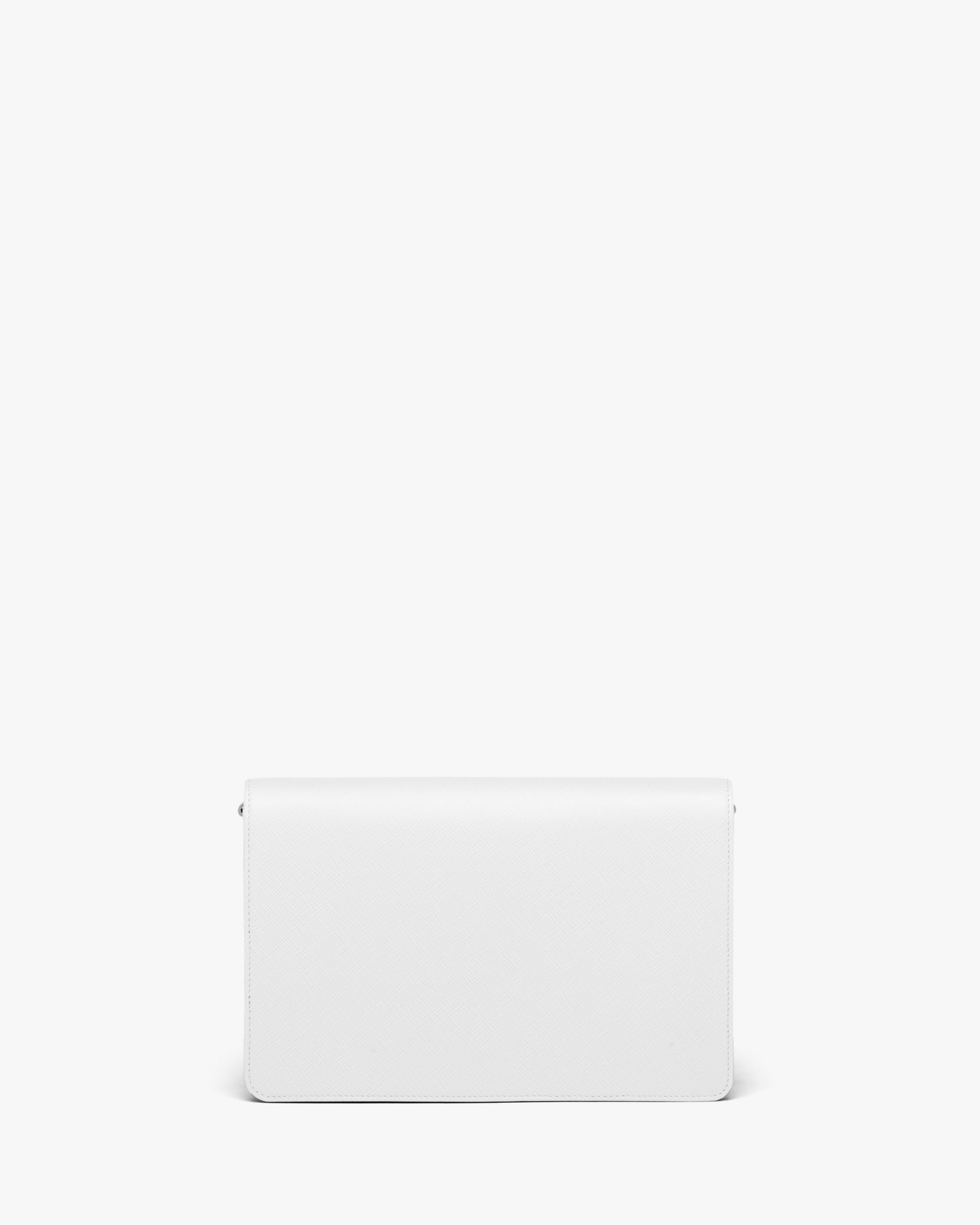 This Saffiano leather mini-bag with shoulder strap has a refined minimalist design. The accessory is decorated with the metal logo.