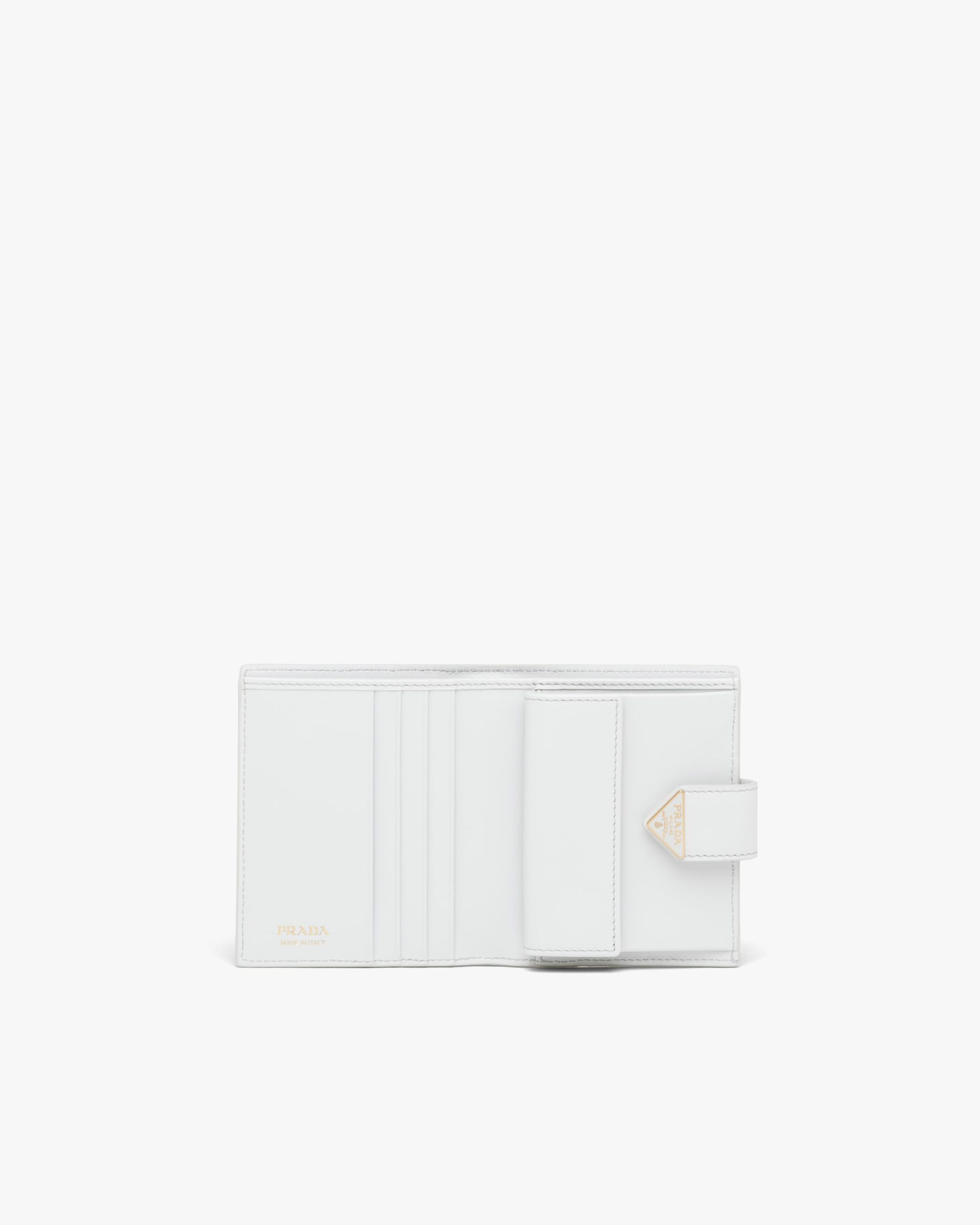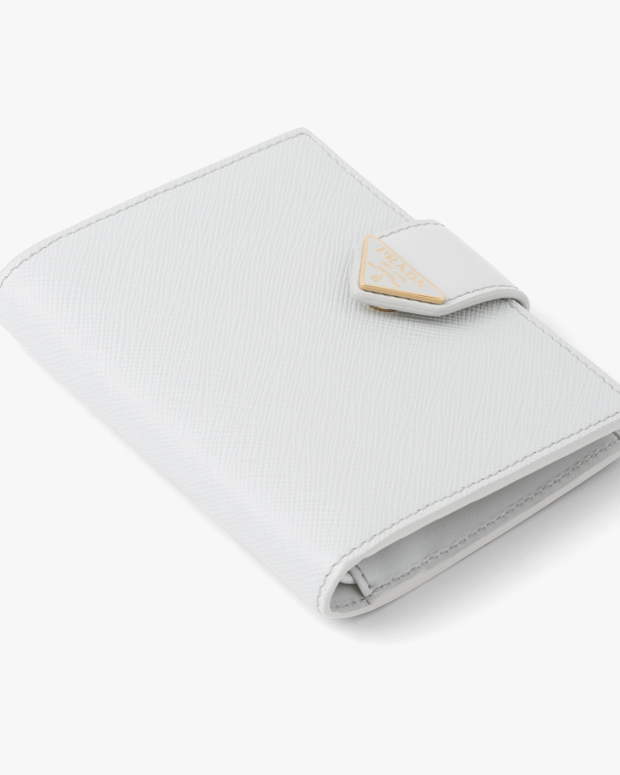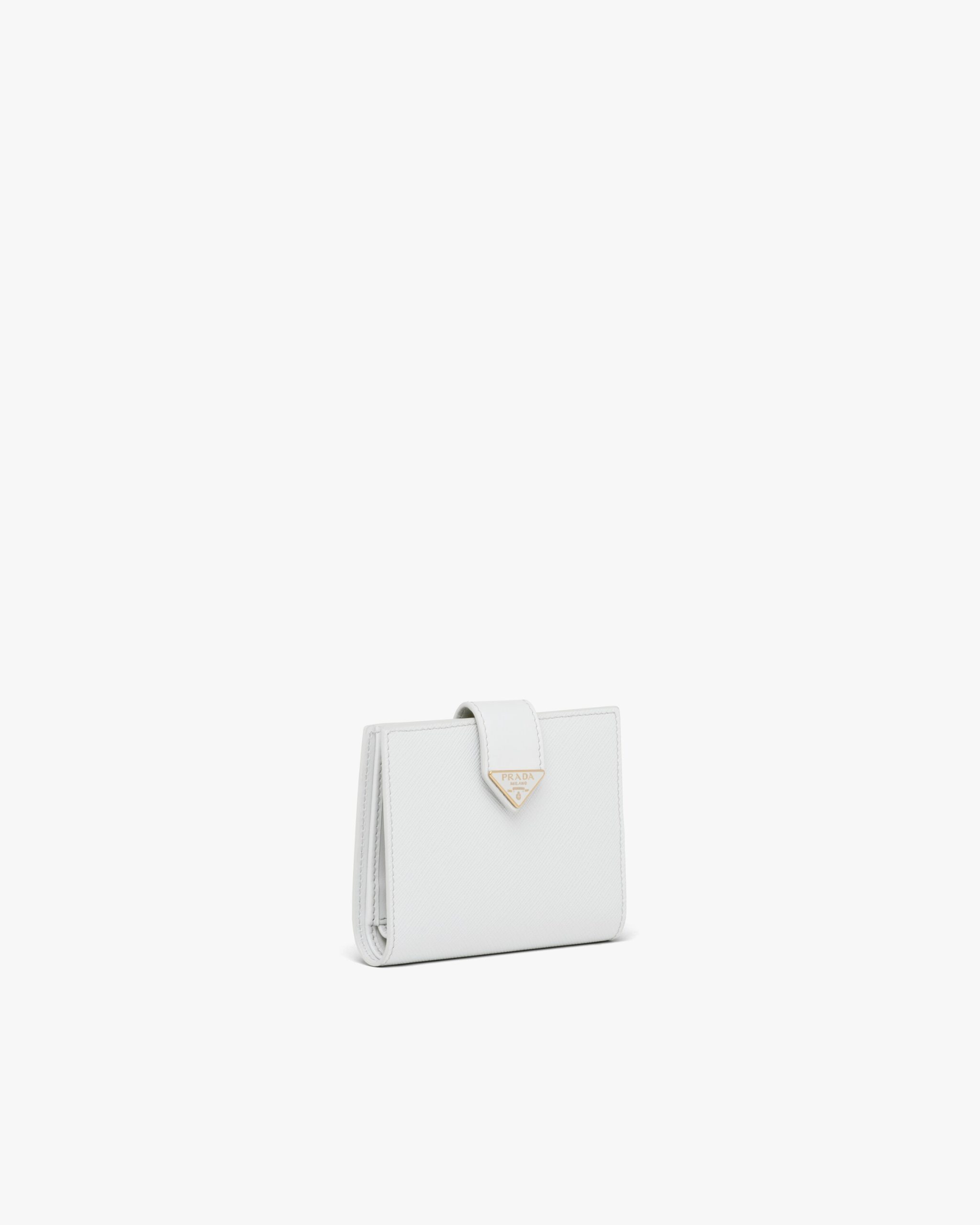 This small wallet with sleek elegance comes in a combination of smooth and Saffiano leather, an iconic Prada material with a crosshatch texture. Characterized by its minimal design and equipped with several compartments and pockets, the accessory is accented with the iconic enameled triangle logo of the brand embellishing the closure.