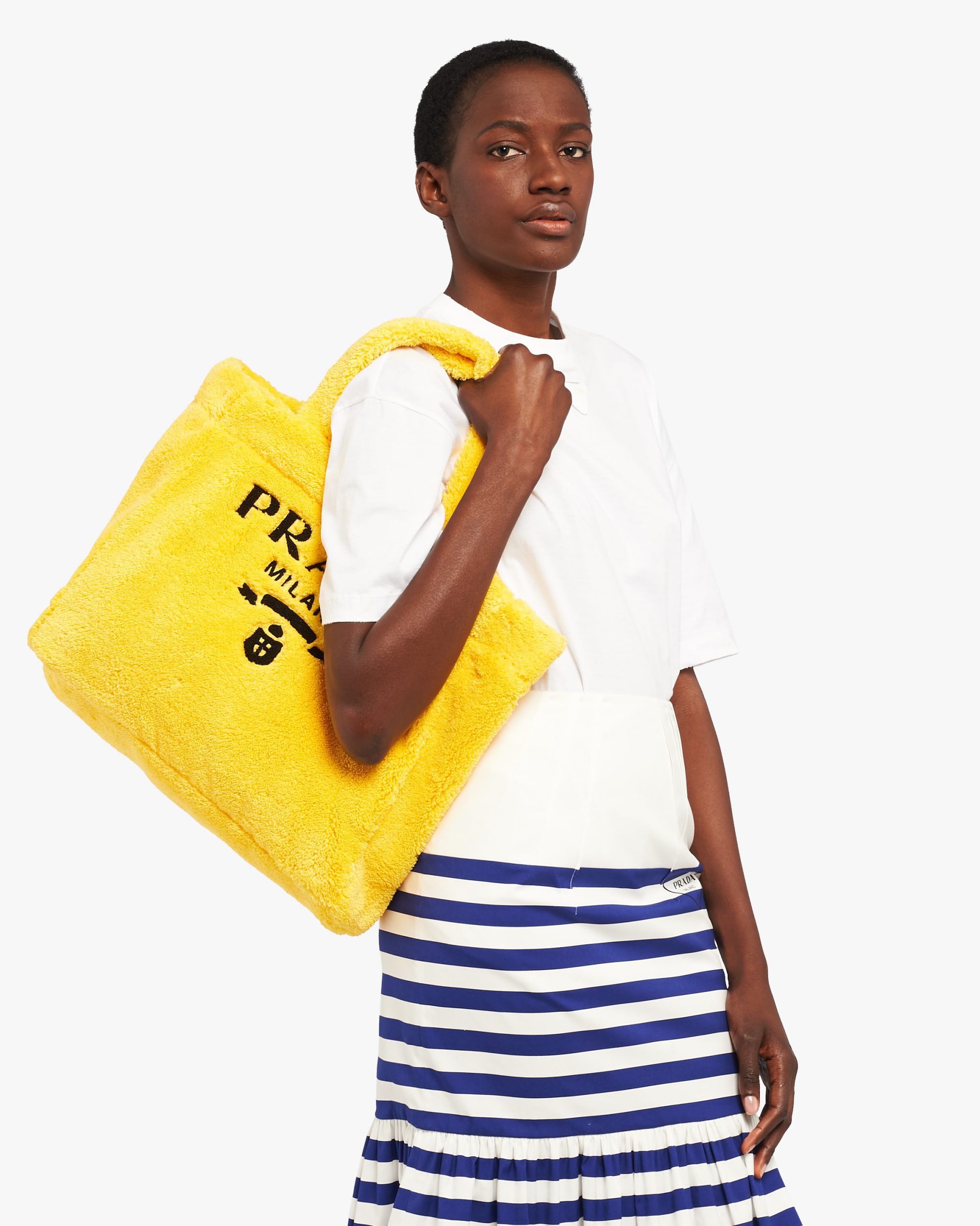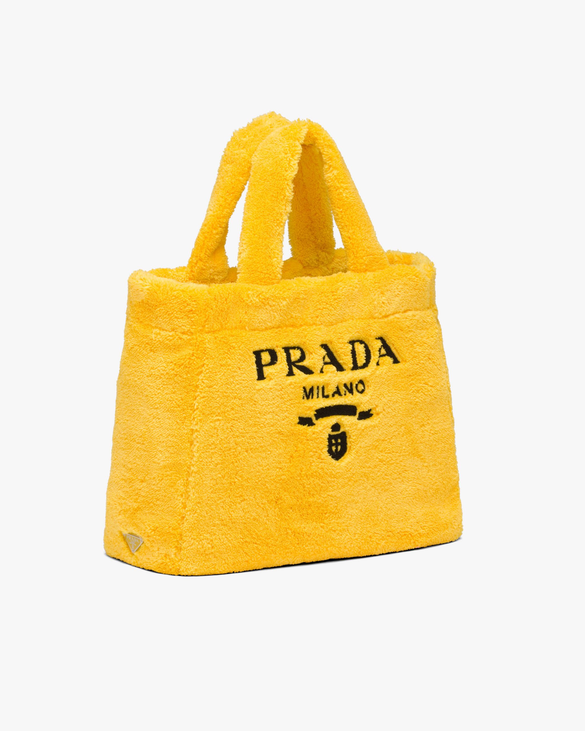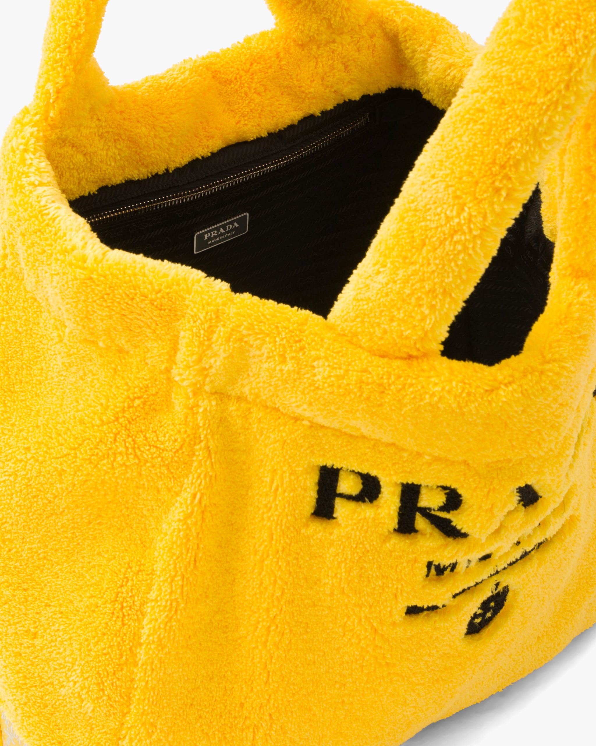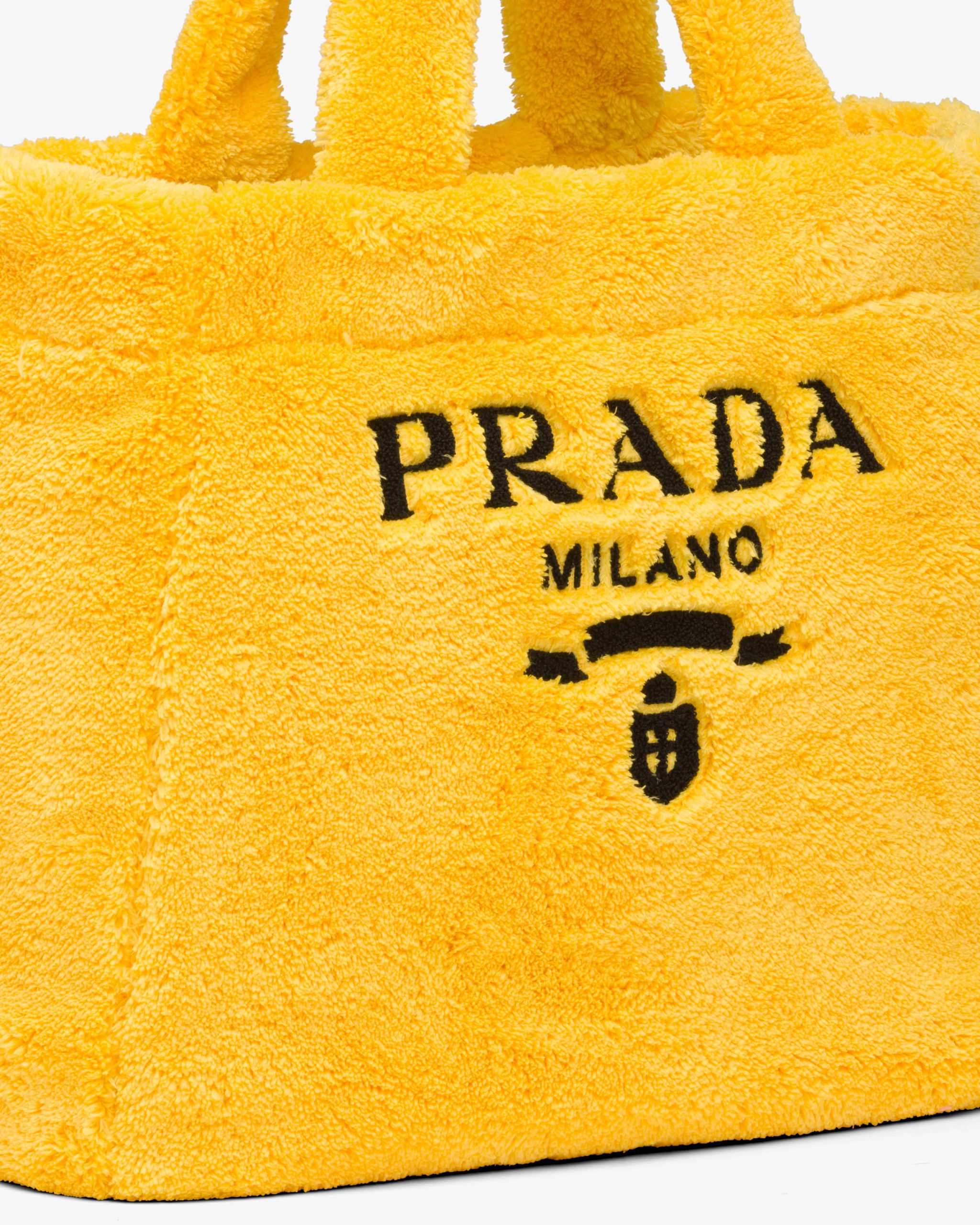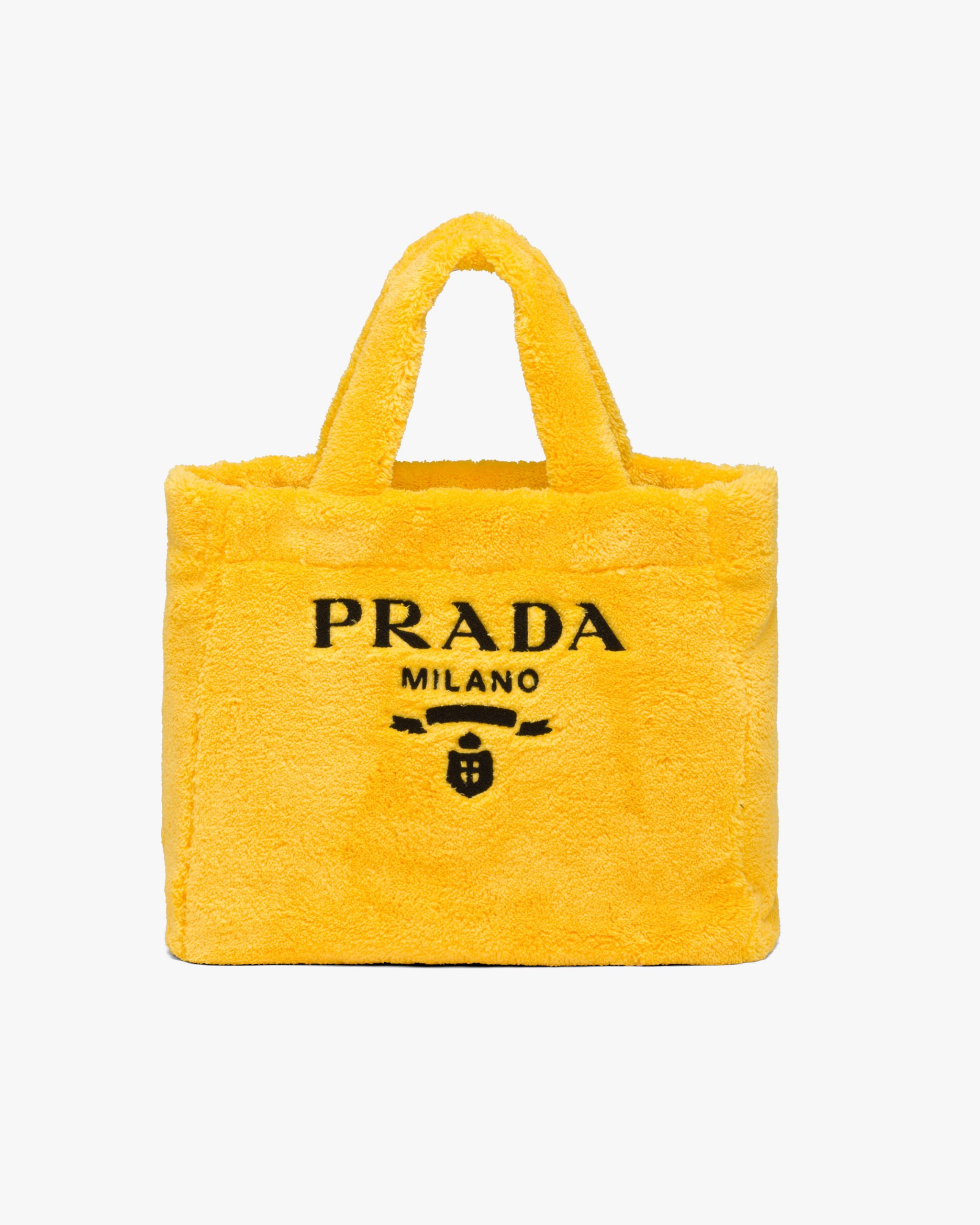 Vivid color contrasts and an ironic character define this tote bag with a deconstructed design in soft terry with a summery mood. A maxi version of Prada’s iconic lettering logo embroidered on the front enhances the accessory.