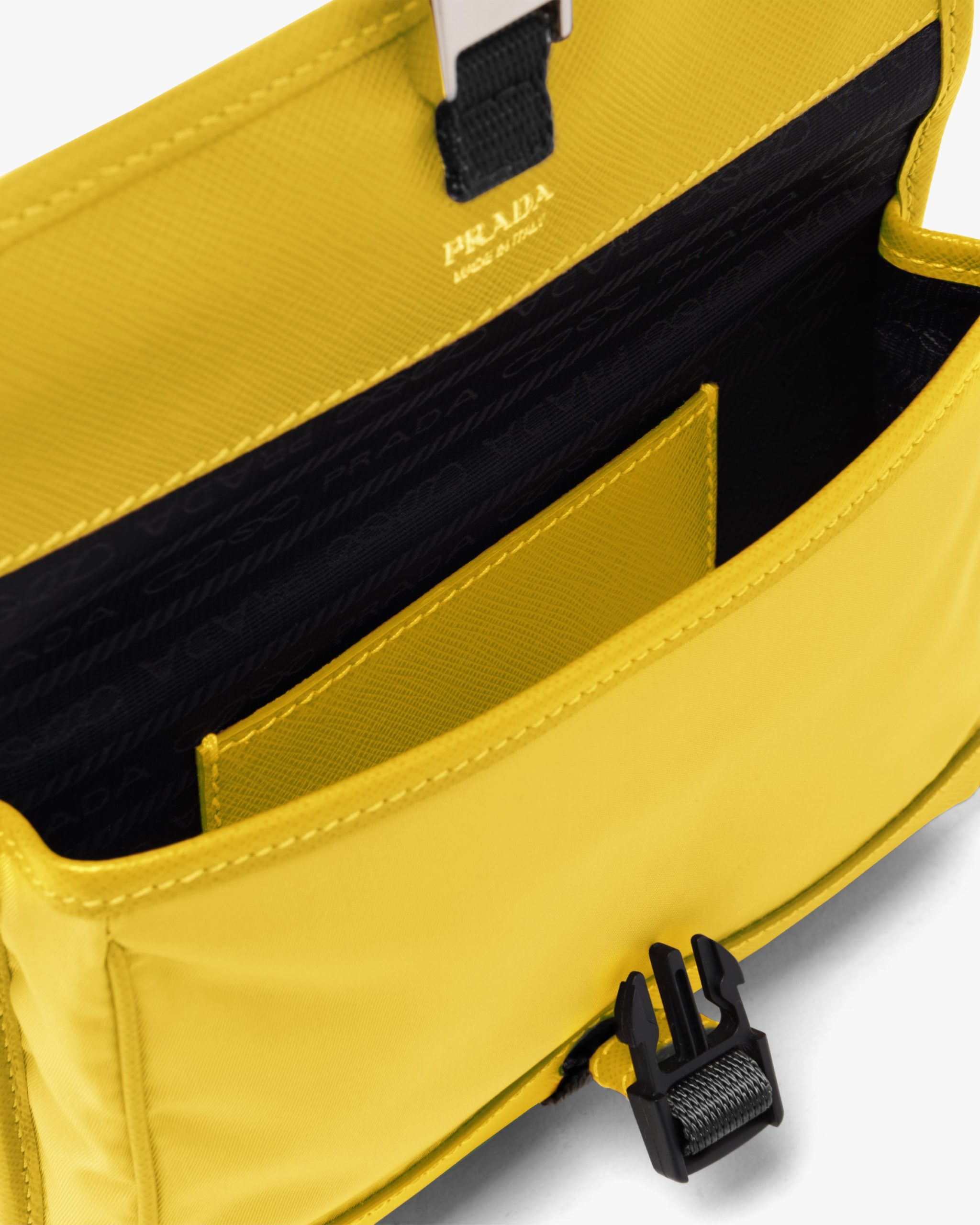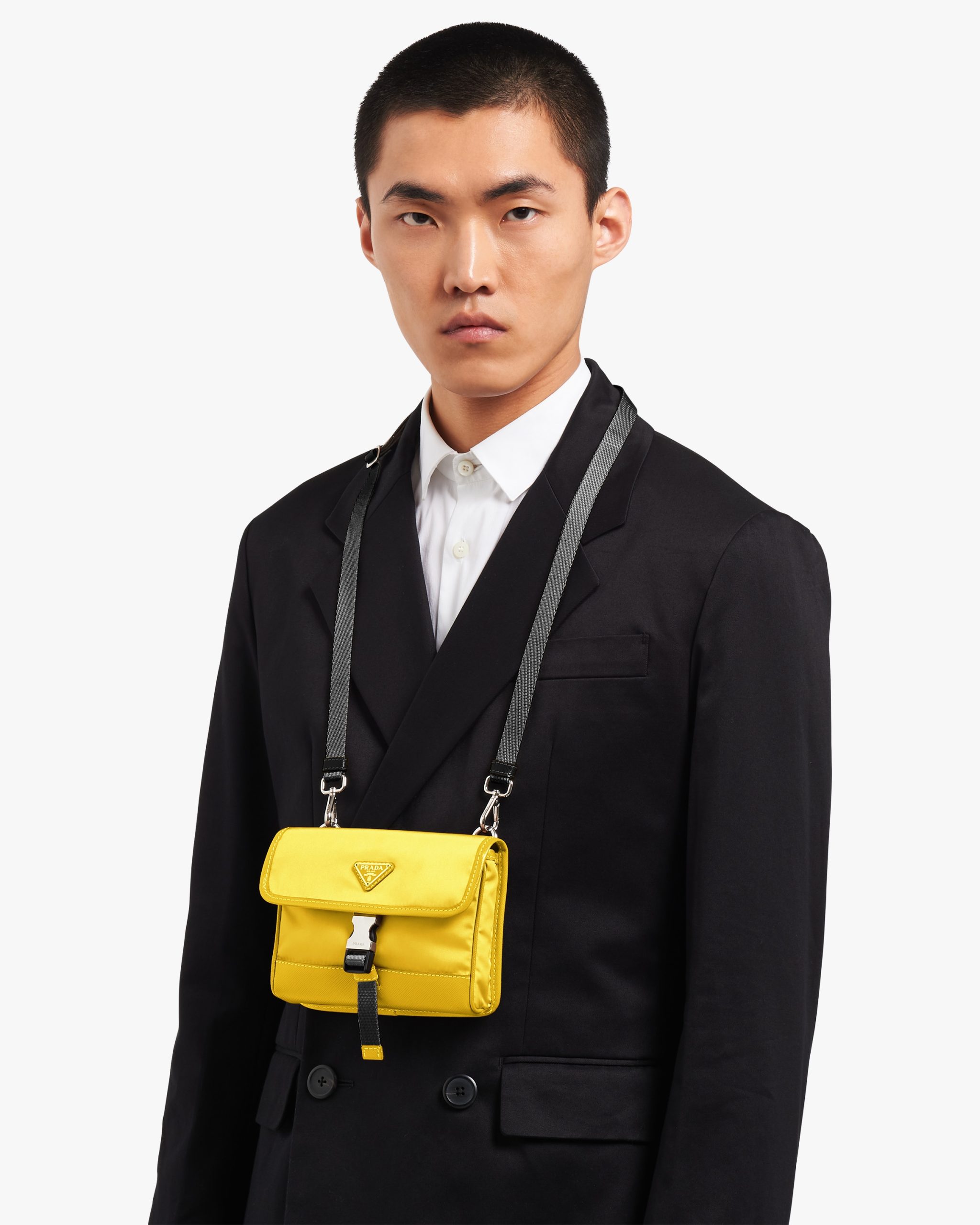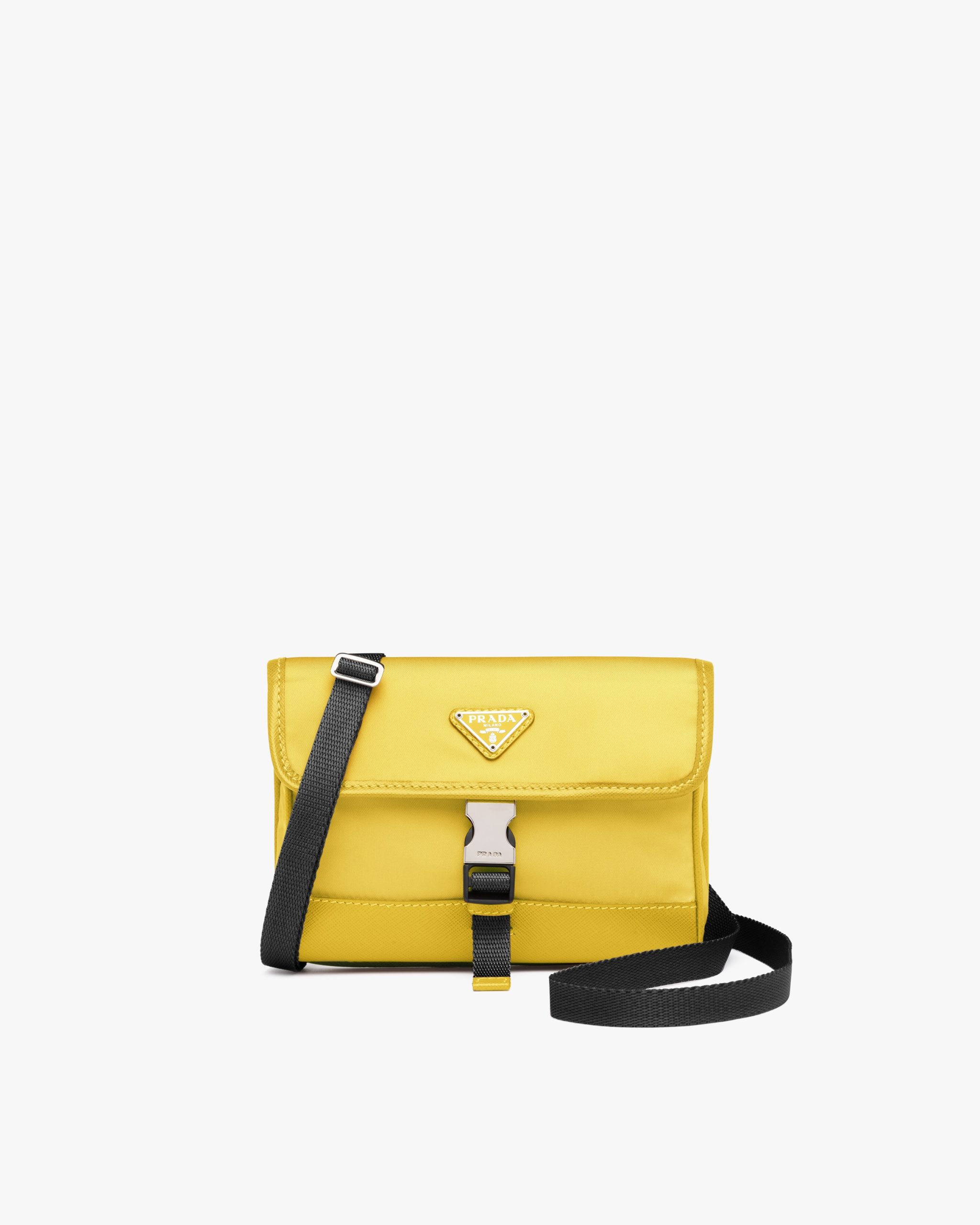 This nylon cellphone case with detachable shoulder strap has Saffiano leather trim. The design of the accessory is completed by the metal side-release buckle and enameled triangle logo.