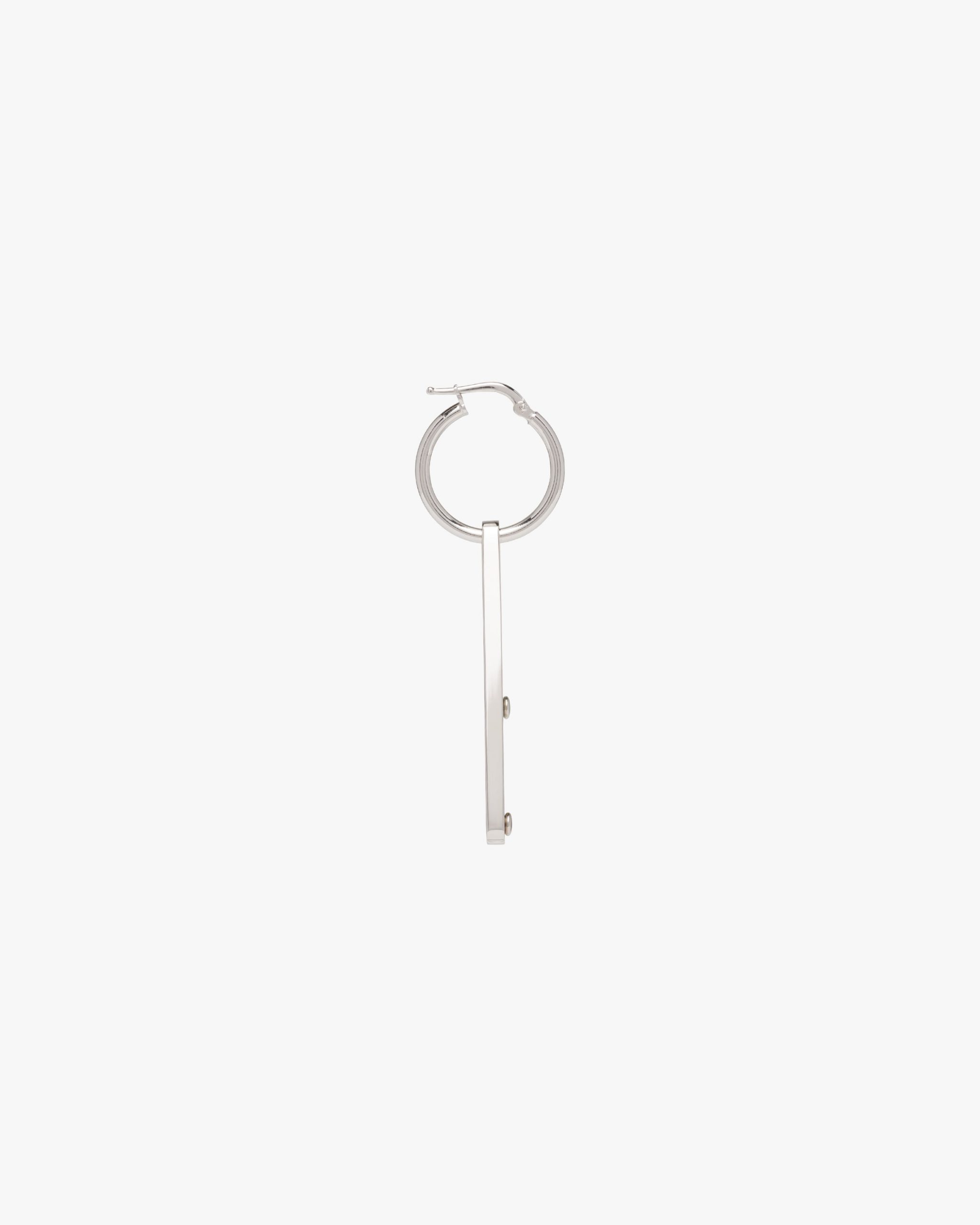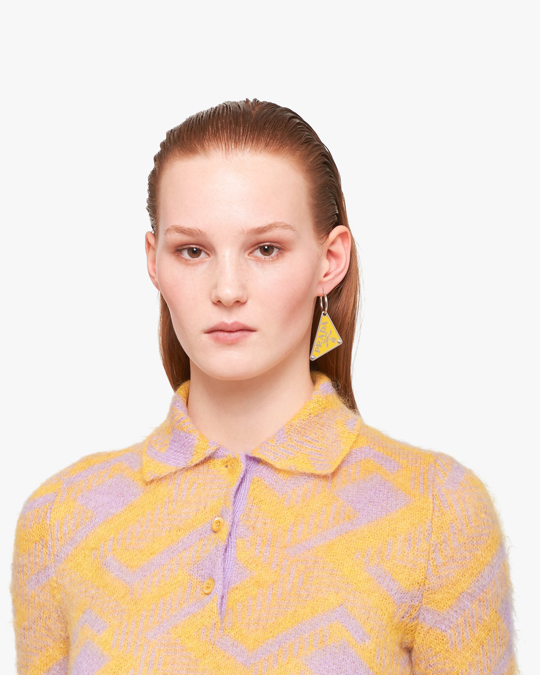 Iconic and sleek, the triangle logo is the protagonist of a new line of jewelry made of 925 sterling silver that reinterprets punk influences in a modern way. Prada’s historic symbol decorated with enamel defines this single earring.