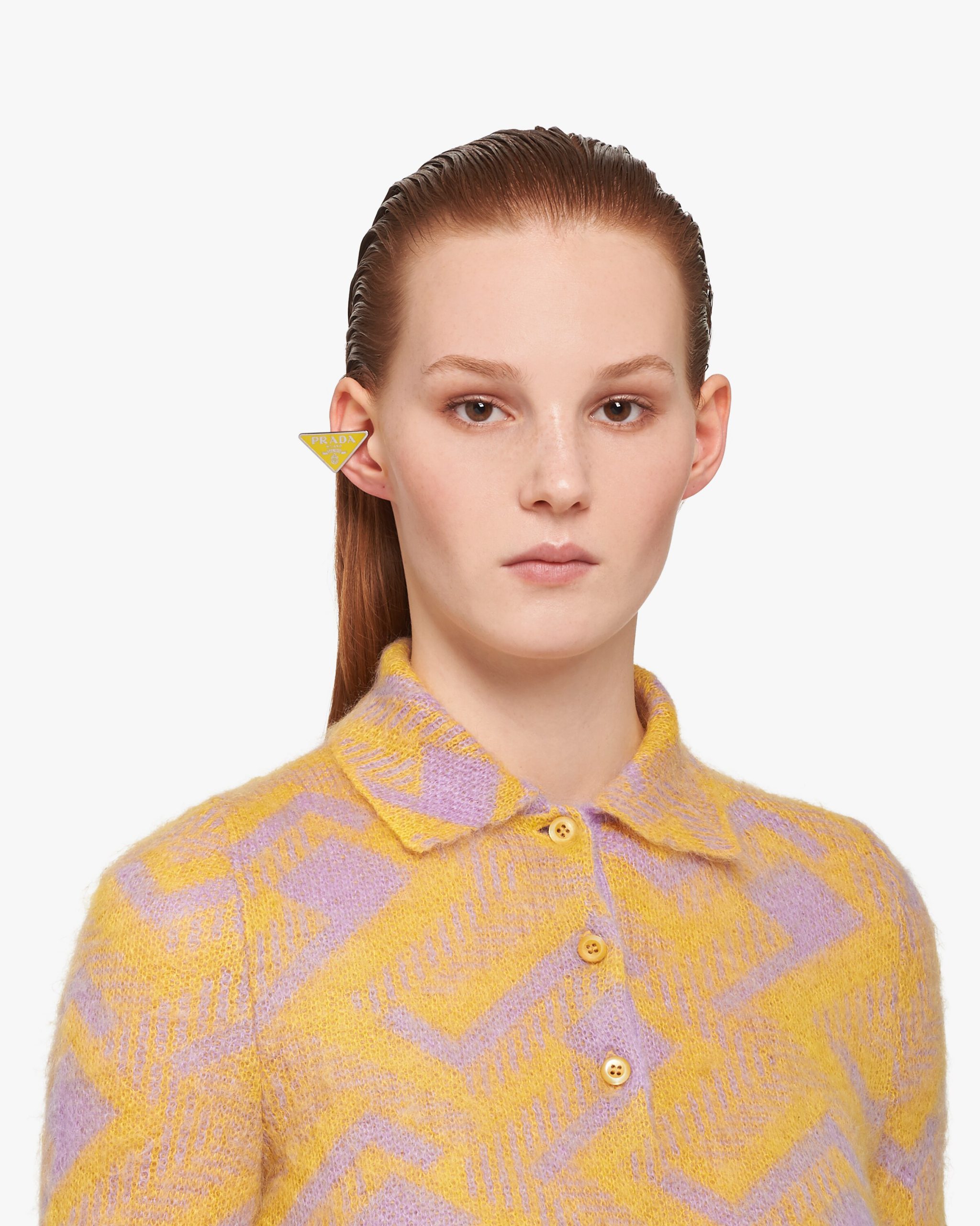 Prada’s historic symbol decorated with enamel defines this single earring worn on the right. Iconic and sleek, the triangle logo is the protagonist of a new line of jewelry made of 925 sterling silver that reinterprets punk influences in a modern way.