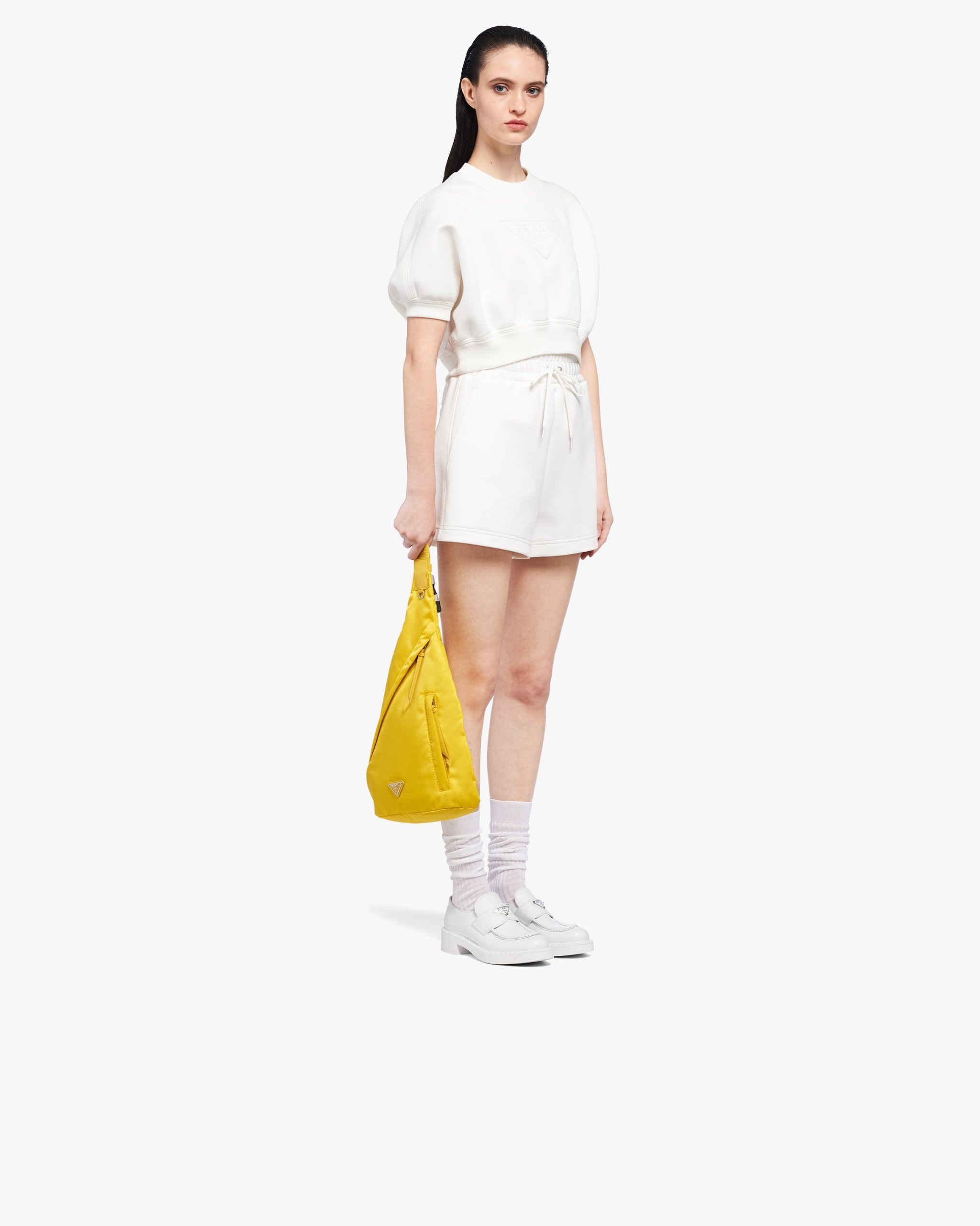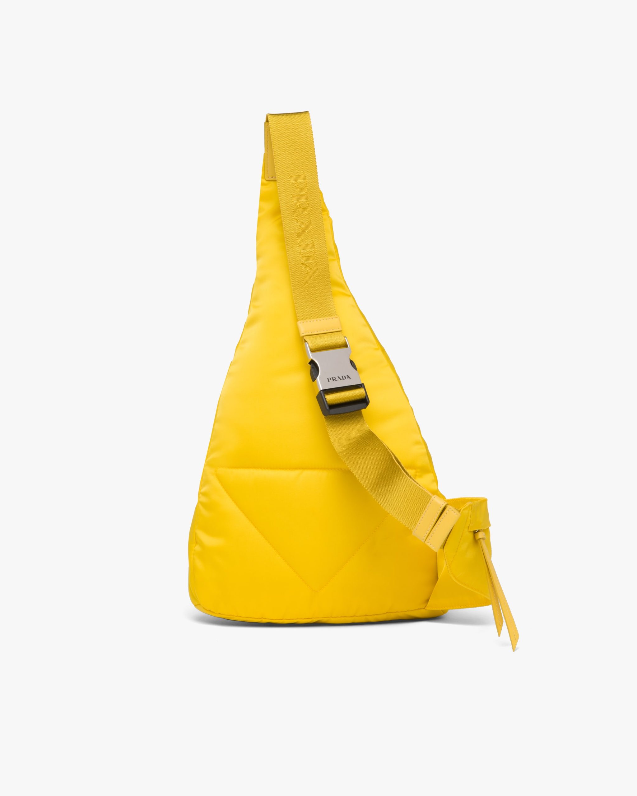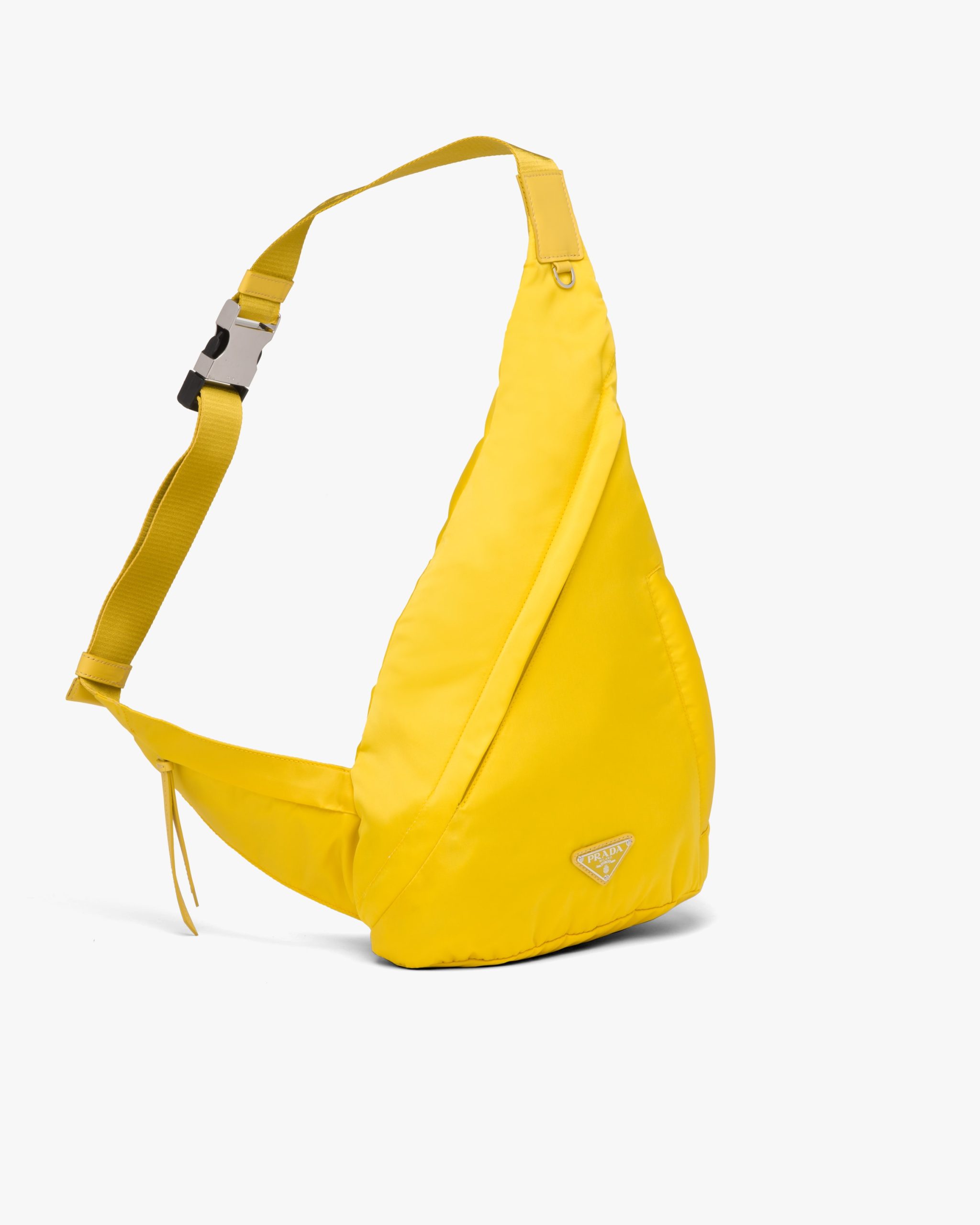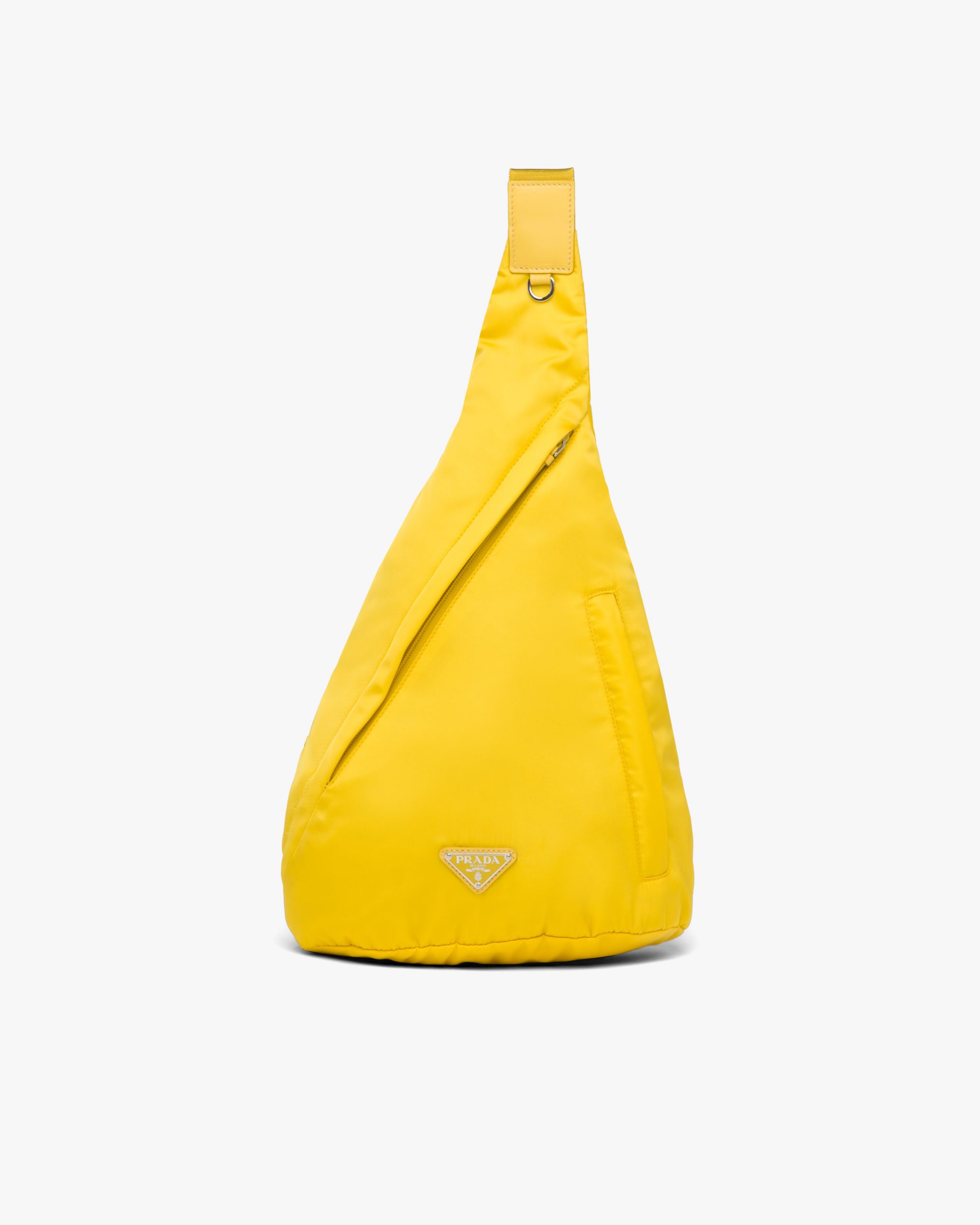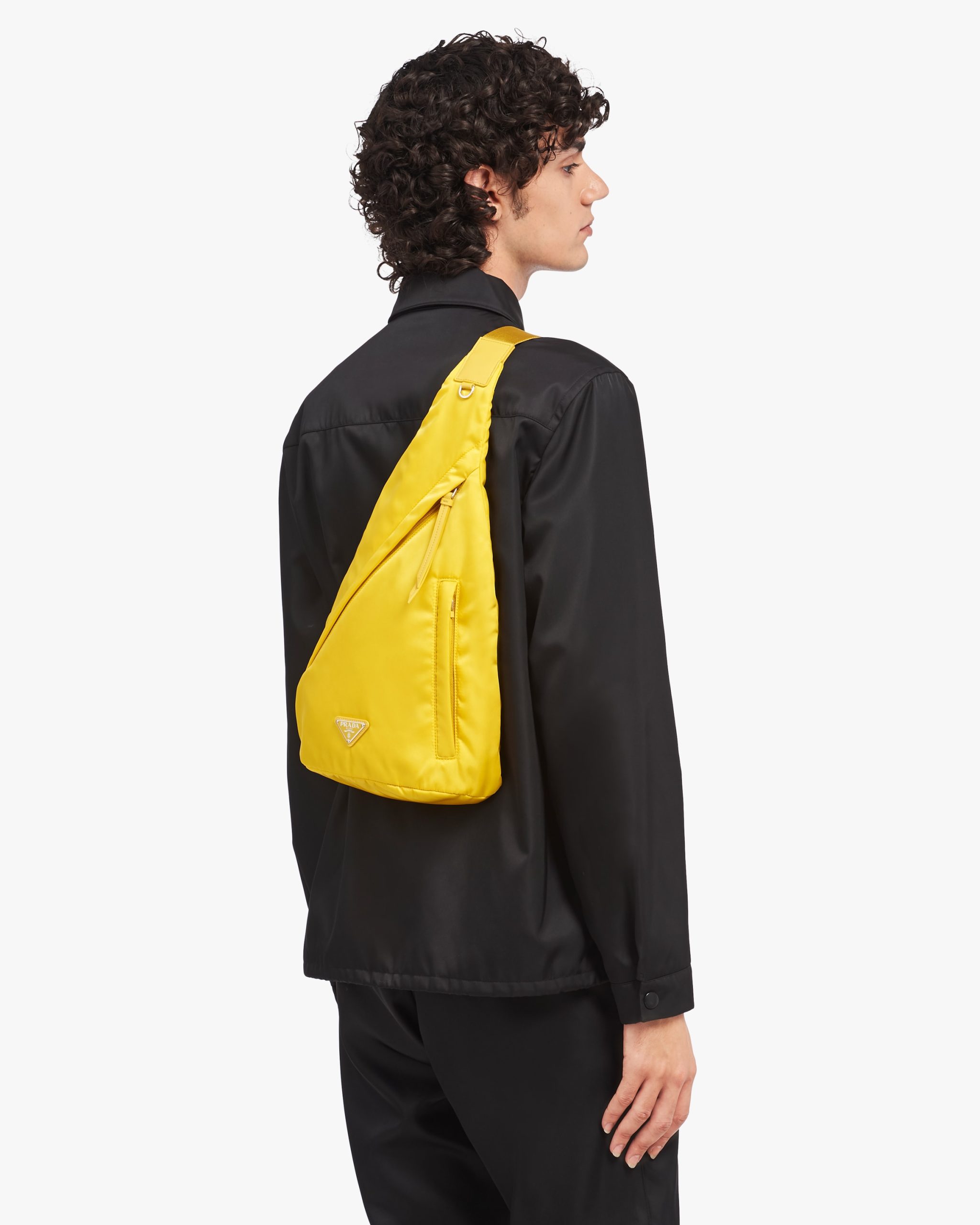 Sleek, minimalist lines are the choice for the new men’s bags for Fall Winter 2021. Defined by its hybrid design, halfway between a backpack and shoulder bag, this accessory has one adjustable woven nylon shoulder strap with side-release buckle and is decorated with the iconic enameled metal triangle logo. The silhouette is made of innovative Re-Nylon, a regenerated yarn produced from recycled plastic trash collectsed in the ocean.