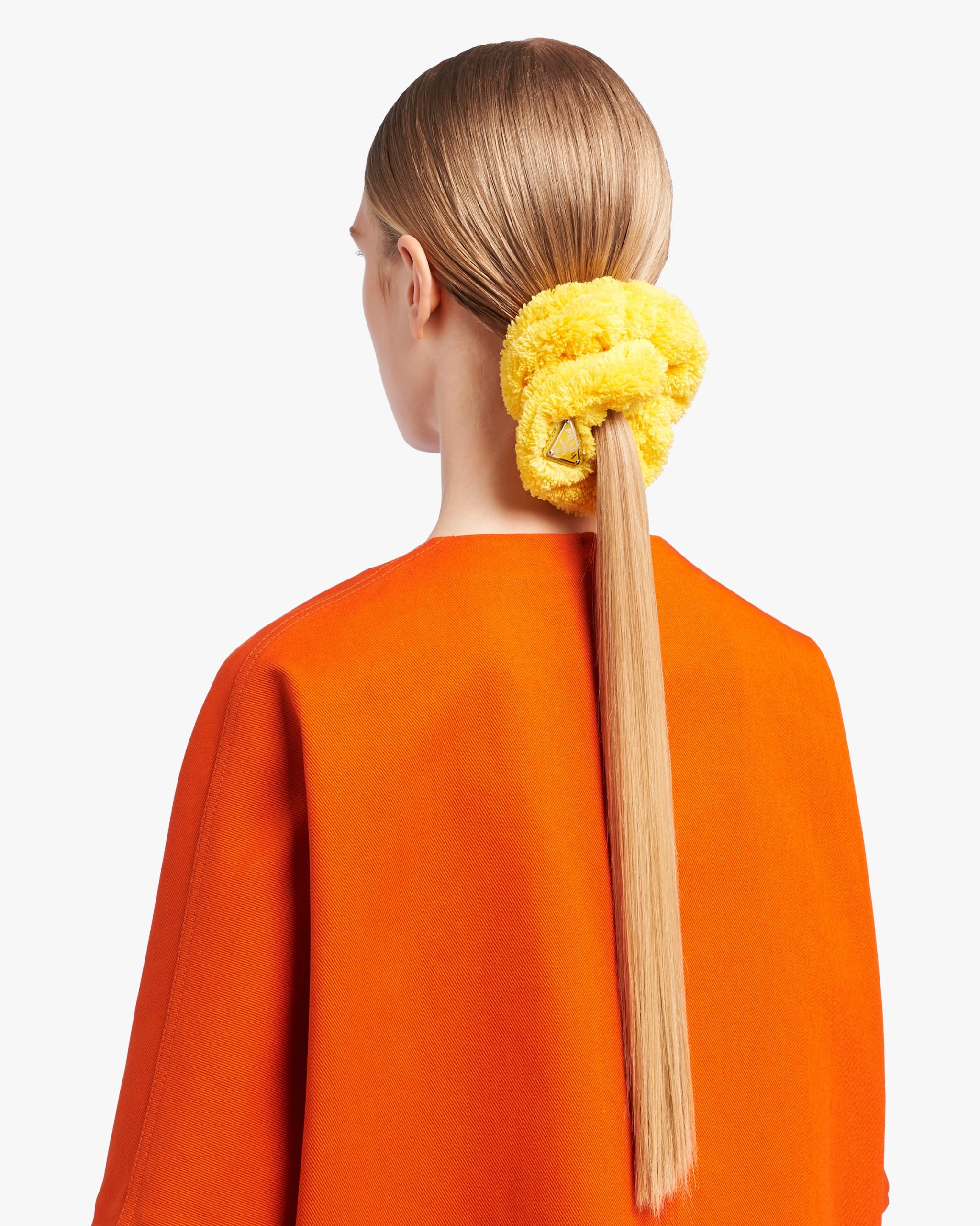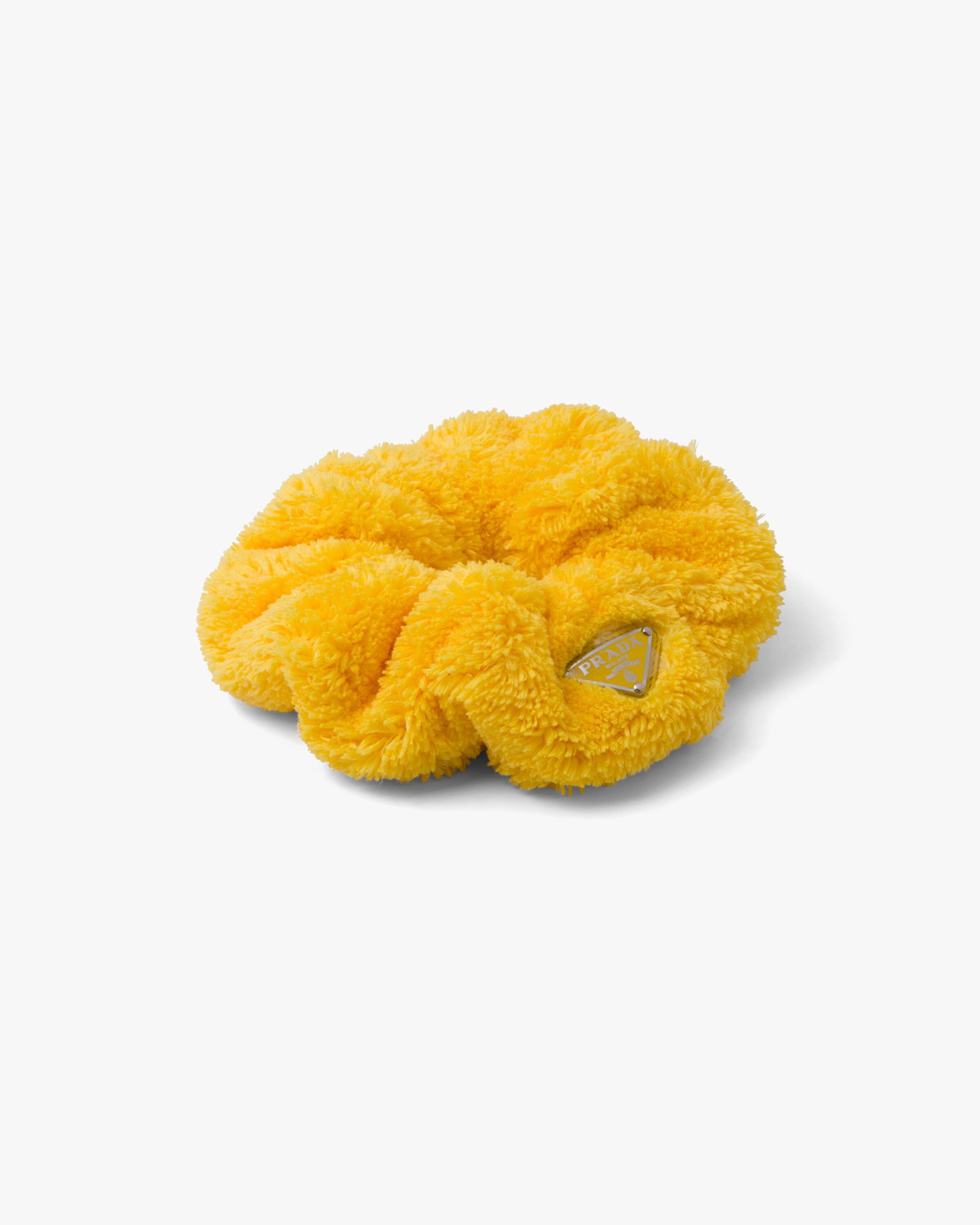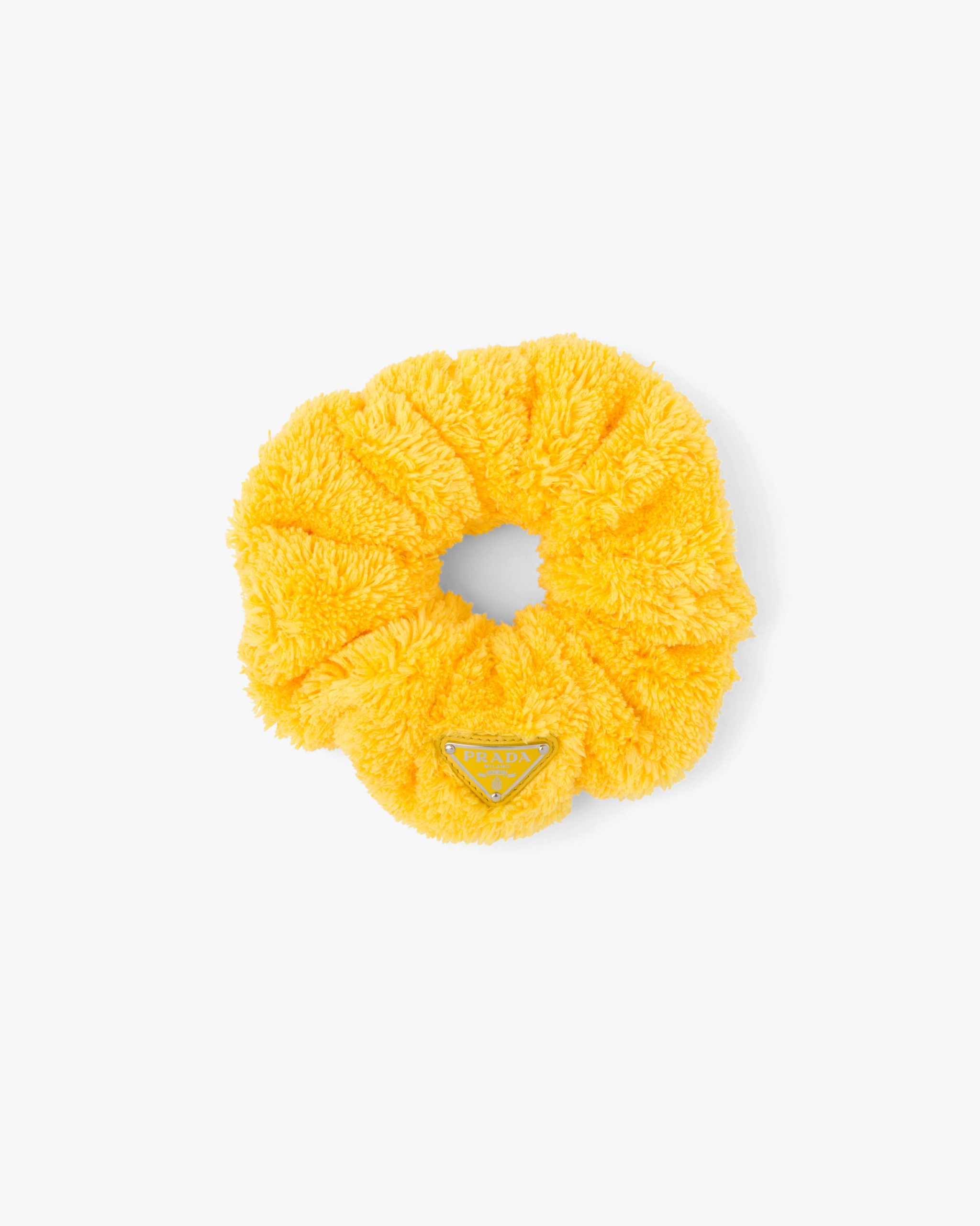 This scrunchie with a retro mood is made of soft terry cloth, a fabric that brings to mind the romantic elegance of summer in the fifties. The enameled triangle logo, an emblematic element of Prada, decorates the design and adds an iconic accent.